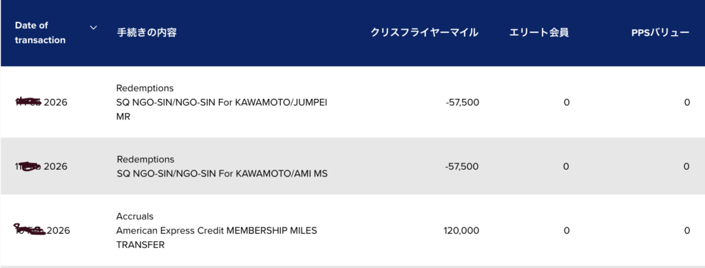 - 150,000ポイント→120,000マイル移行、114,000マイルで夫婦2名往路発券が今回の実績