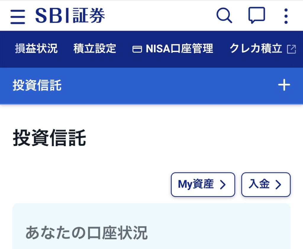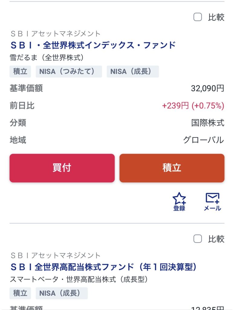 今回は例として「SBI・全世界株式インデックス・ファンド(雪だるま)」などの画面で見てみましょう。