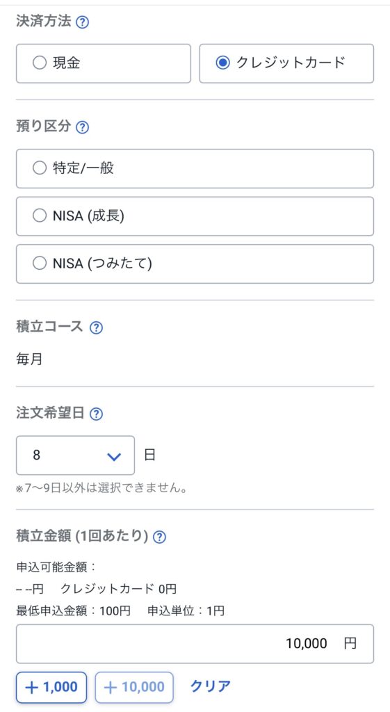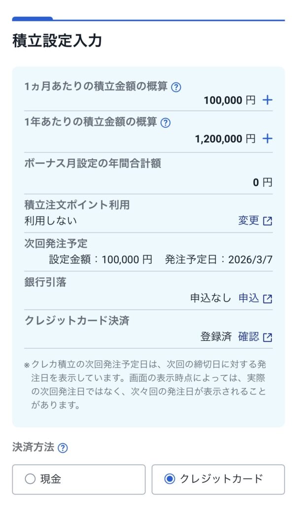 ※クレカ積立の場合、注文日は自動的に毎月1日(設定によっては8日などカードによる)に固定されることが多いです。